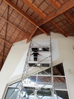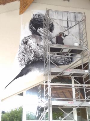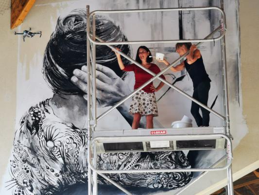 La réalisation de la fresque s’est faite en 2 phases : 2 jours pour la préparation du mur et 5 jours pour la réalisation de la fresque ce qui a représenté 70 h de travail.