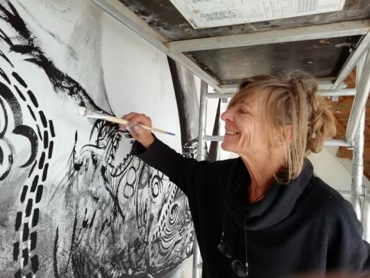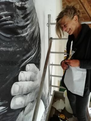 Cette œuvre est une performance, c’est la première fois que Cynthia Evers se servait d’ 1 mur comme toile, qu’elle peignait sur une surface aussi grande, en hauteur et sans aucun recul.En effet, le recours à un échafaudage interdisait toute possibilité de recul. C’était aussi la 1ère fois qu’elle peignait face à des publics qui chaque jour observaient, commentaient et interféraient sur l’élaboration de l’œuvre. Toutes les étapes de la réalisation de cette fresque ont été photographiées. Il était important de garder une trace et une mémoire de ces instants d’exception pour l’artiste et pour nous spectateurs attentifs intégrés au processus de création.