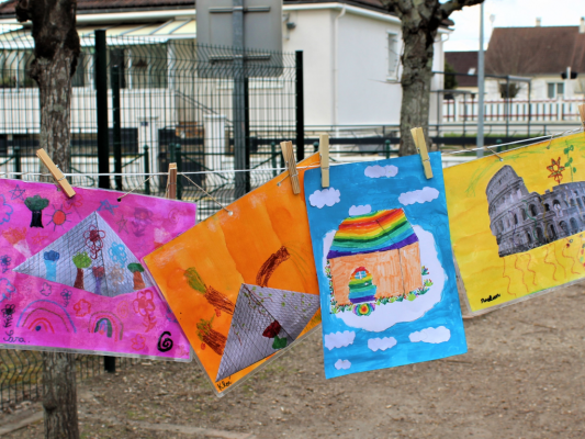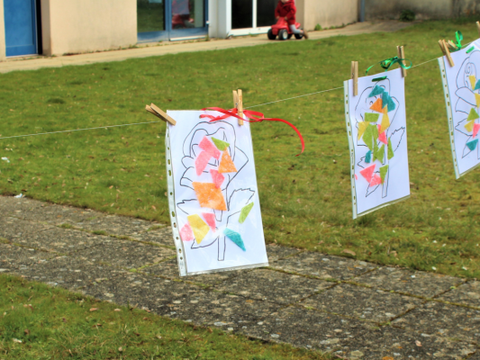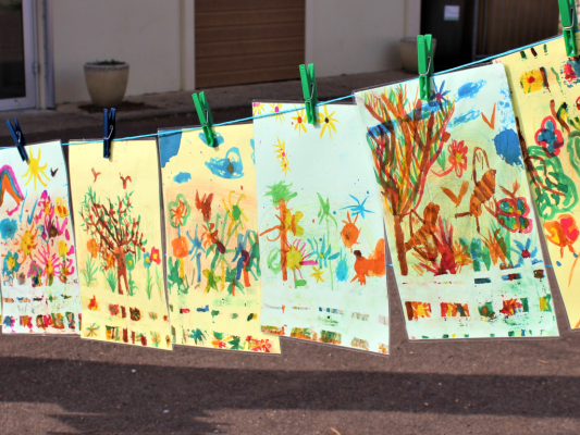 Des dessins exposés sur une corde à linge pour que chaque personne qui le souhaite puisse partager les fruits de son imagination.