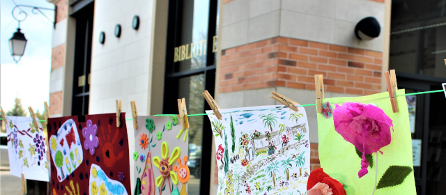 Des dessins exposés sur une corde à linge pour que chaque personne qui le souhaite puisse partager les fruits de son imagination.
